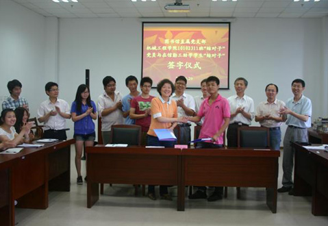 为加强基层党建,深入开展“创先争优”活动,发挥党员先锋模范作用,共同促进全馆党员育人工作,6月29日下午,图书馆直属党支部举行党支部与机械工程学院10102311班、党员与在馆勤工助学学生结对共建签约仪式。图书馆直属党支部书记钟晓勤、馆长张赟彬、机械学院党总支副书记、副院长孔令超以及图书馆全体党员、结对班级学生代表参加了签约仪式。