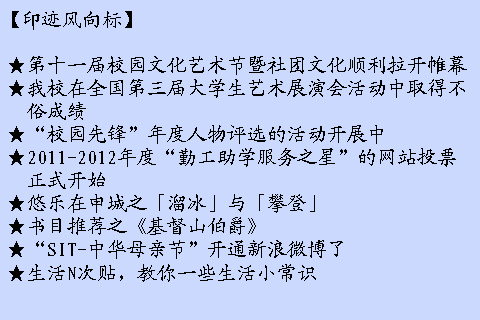 上海应用技术学院“青春•映迹”手机报在起航,正陪伴着我们的童鞋,在实现新闻资讯零距离的路上逐步成长!